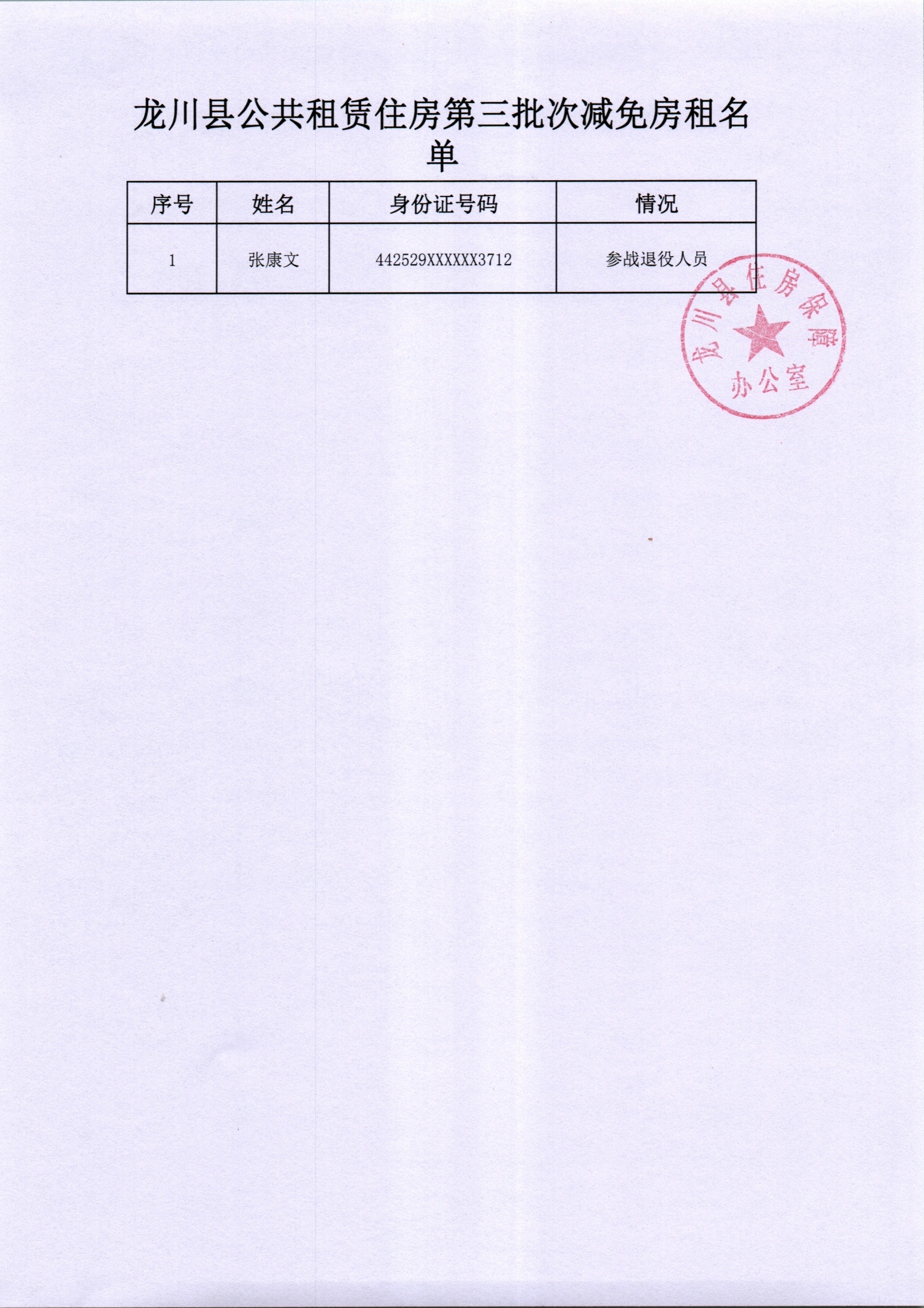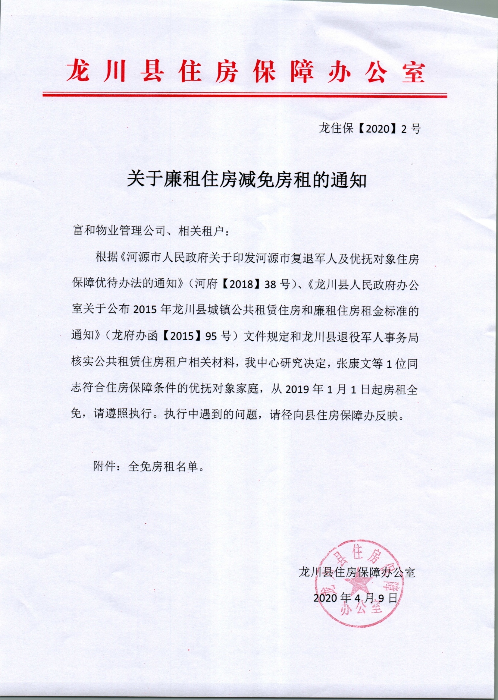 根據(jù)《河源市人民政府關(guān)于印發(fā)河源市復(fù)退軍人及優(yōu)撫對象住房保障優(yōu)待辦法的通知》(河府【2018】38號(hào))、《龍川縣人民政府辦公室關(guān)于公布2015年龍川縣城鎮(zhèn)公共租賃住房和廉租住房租金標(biāo)準(zhǔn)的通知》(龍府辦函【2015】95號(hào))文件規(guī)定和龍川縣退役軍人事務(wù)局核實(shí)公共租賃住房租戶相關(guān)材料,我中心研究決定,張康文等1位同志符合住房保障條件的優(yōu)撫對象家庭,從2019年1月1日起房租全免,請遵照執(zhí)行。執(zhí)行中遇到的問題,請徑向縣住房保障辦反映。